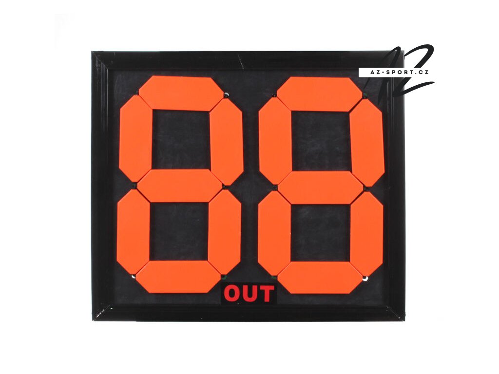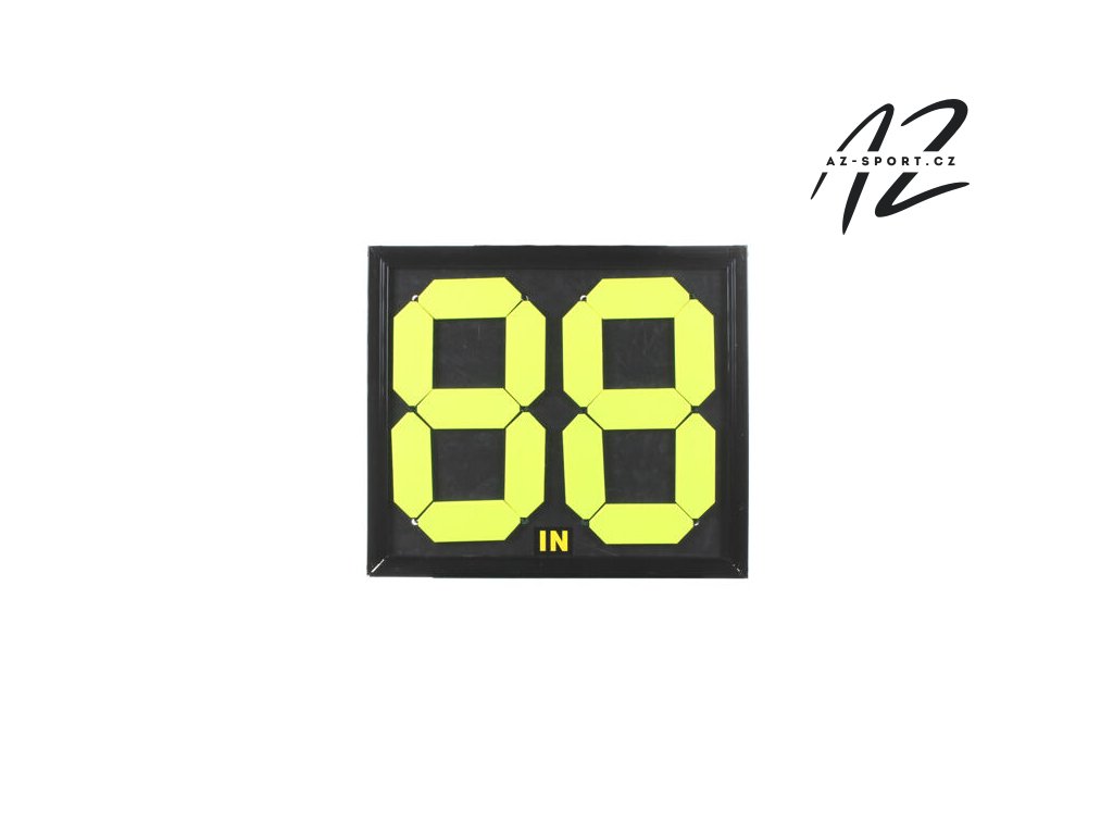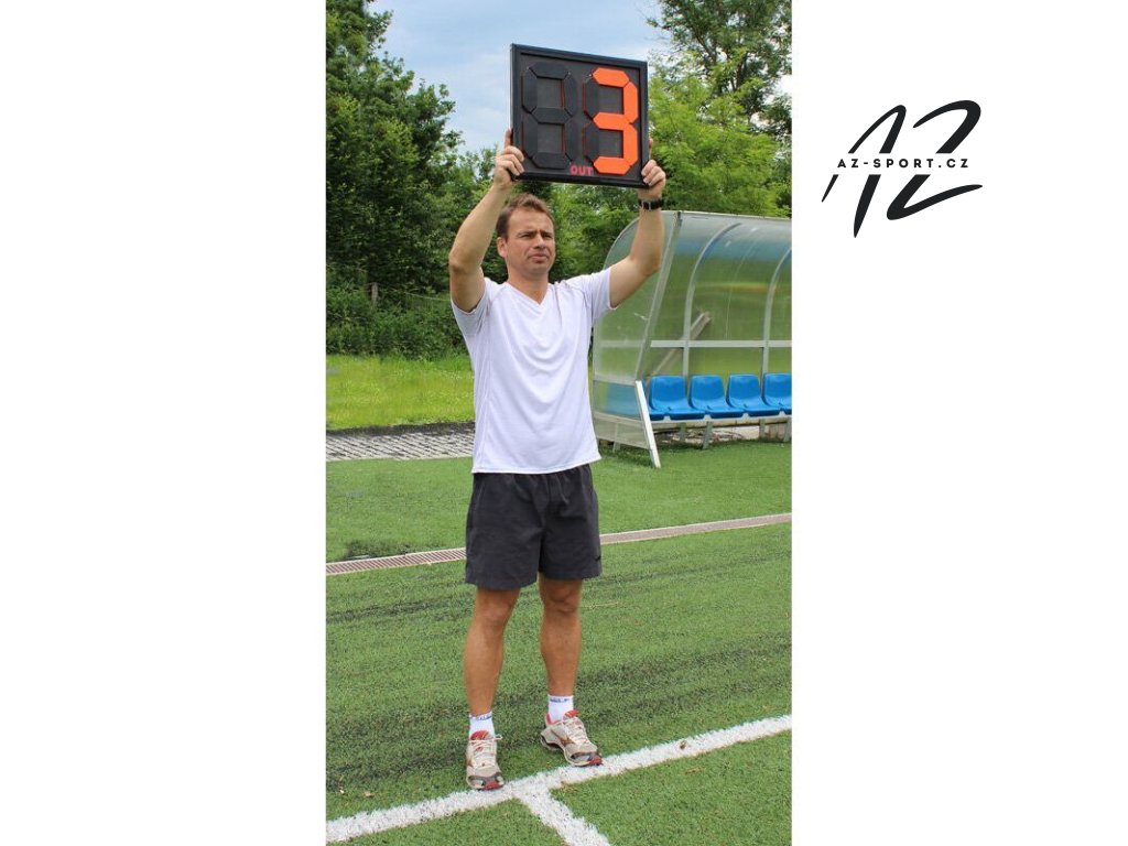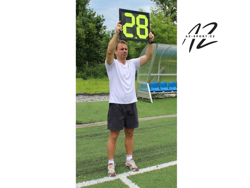 Trenérská pomůcka při zápase pro výměnu hráčů v poli, s reflexními číslicemi pro lepší viditelnost.