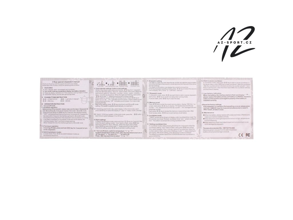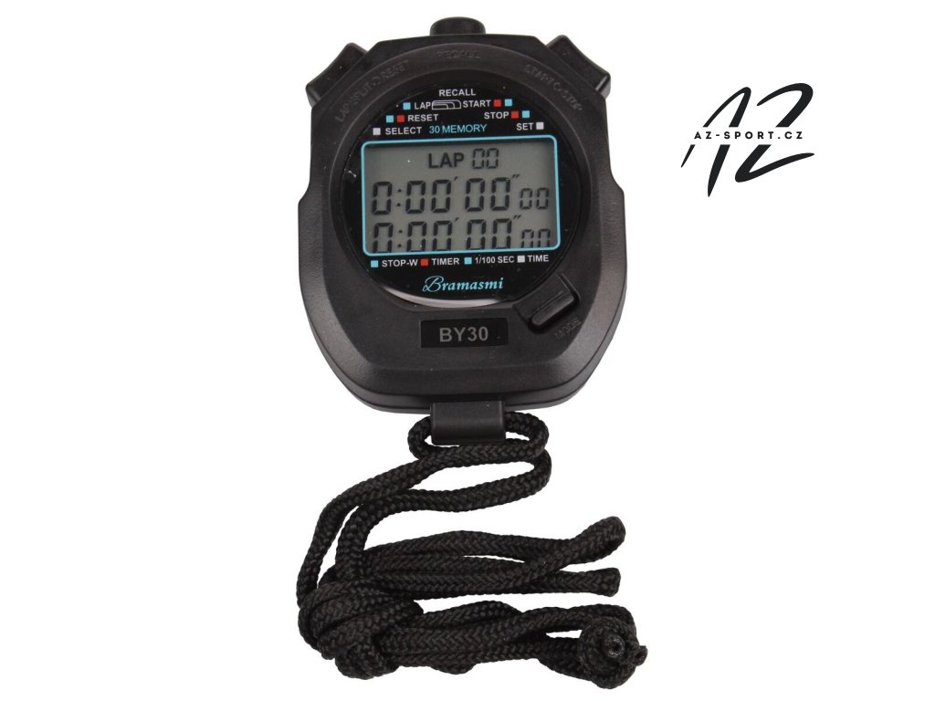 Kvalitní sportovní stopky Bramasmi BY30 s 30 mezičasy jsou praktickou pomůckou pro odměřování kratších časových intervalů. Využití najdou v celé řadě sportů, jako například běh, plavání, cyklistika, atletika, apod. Stopky BY30 jsou vhodné jak pro trenéry sportovců, tak pro učitele tělesné výchovy i sportovní kroužky. Funkce: - Čas, datum, budík, chronograf, odpočítávání; - Funkce desetinných stopek; - Zapnutí/vypnutí, tlačítko ztlumení, zobrazení teploty, indikace slabé baterie; - Třířádkový displej, rozlišení 1/100 za sekundu, počítání max. do 10 hodin; - 30 paměťových záznamů s mezičasy a časy kol.Doplňkové parametry