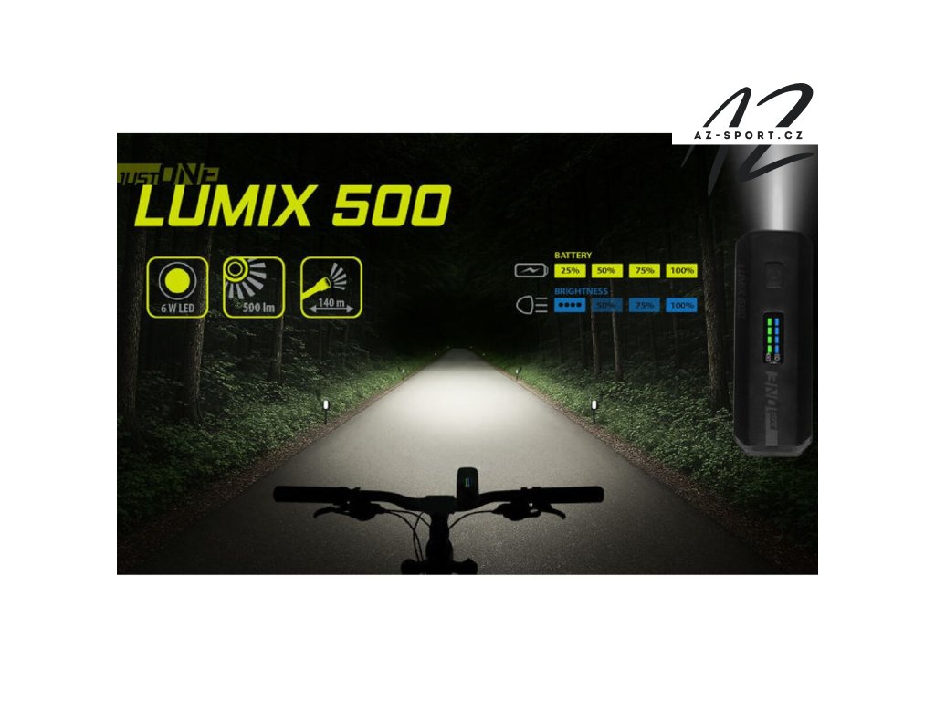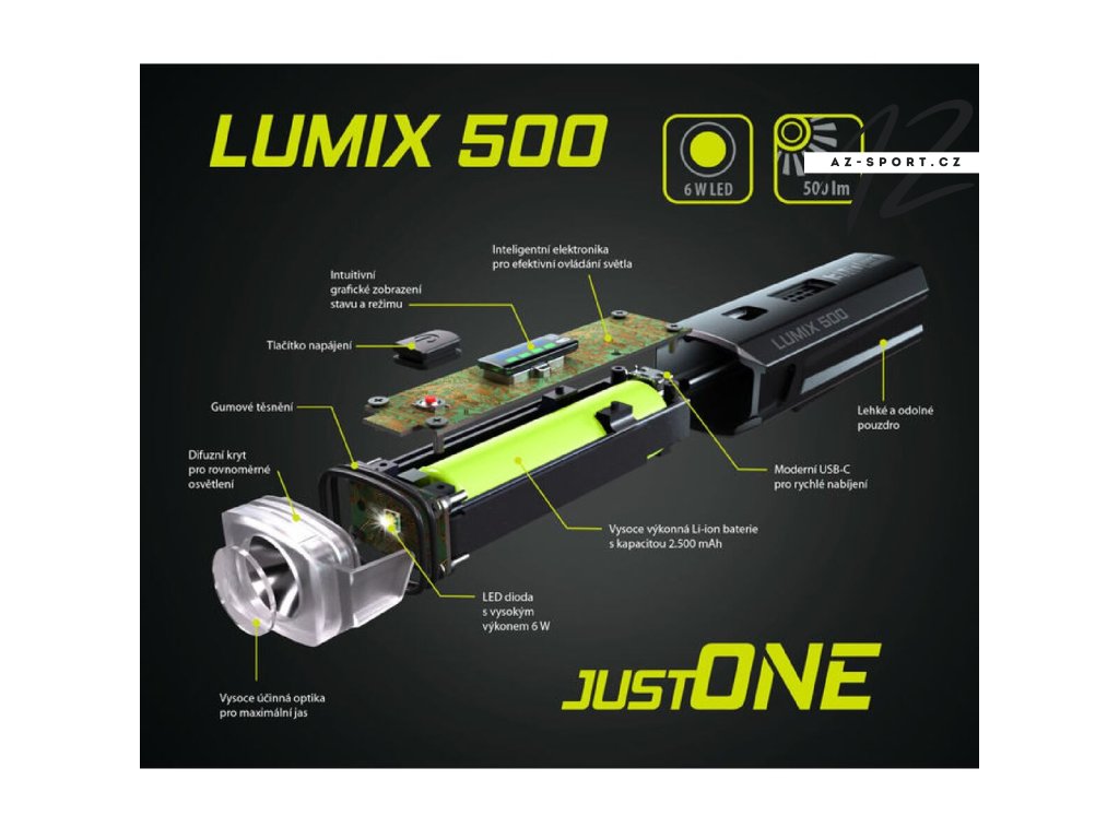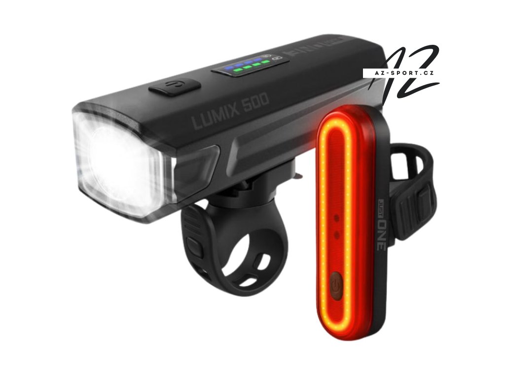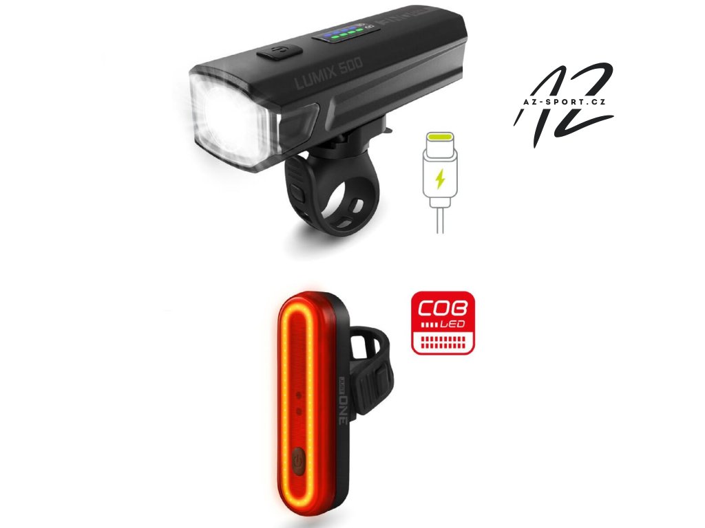 Sada osvětlení na kolo ONE Lumix 500 obsahuje dobíjecí přední i zadní světlo. Obě světla mají voděodolnou konstrukci a jejich montáž i demontáž je jednoduchá a rychlá. Přední světlo má vysoce výkonnou bílou LED diodu 6 W a 4 funkce – 3 intenzity svícení, blikání. Zadní světlo vysoce výkonné červené COB LED diody s 6 funkcemi – 2 intenzity svícení, 4 typy blikání. Obě světla lze nabíjet pomocí kabelu USB-C, který je součástí balení. Přední světlo LUMIX 500 - vysoce výkonná bílá LED dioda 6 W - 4 funkce – 3 intenzity svícení, blikání - grafické zobrazení funkcí - světelný tok 500 lm - dosvit cca 140 m - doba svícení až 13 h - dobíjecí Li-ion baterie s kapacitou 2.500 mAh - grafické zobrazení stavu nabití baterie - dobíjení baterie kabelem USB-C - voděodolná konstrukce IPX4 - montáž bez nářadí - rozměry 97 x 34 x 25 mm - hmotnost pouze 105 g Zadní světlo FLASH 40 - vysoce výkonné červené COB LED diody - 6 funkce – 2 intenzity svícení, 4 typy blikání - vodorovné i svislé umístění - světelný tok 40 lm - viditelnost cca 1.000 m - doba blikání cca 15 h - dobíjecí Li-ion baterie s kapacitou 710 mAh - indikátor nízkého stavu baterie - dobíjení baterie kabelem USB-C - voděodolná konstrukce IPX4 - montáž bez nářadí - rozměry 80 x 20 x 18 mm - hmotnost pouze 35 gDoplňkové parametry