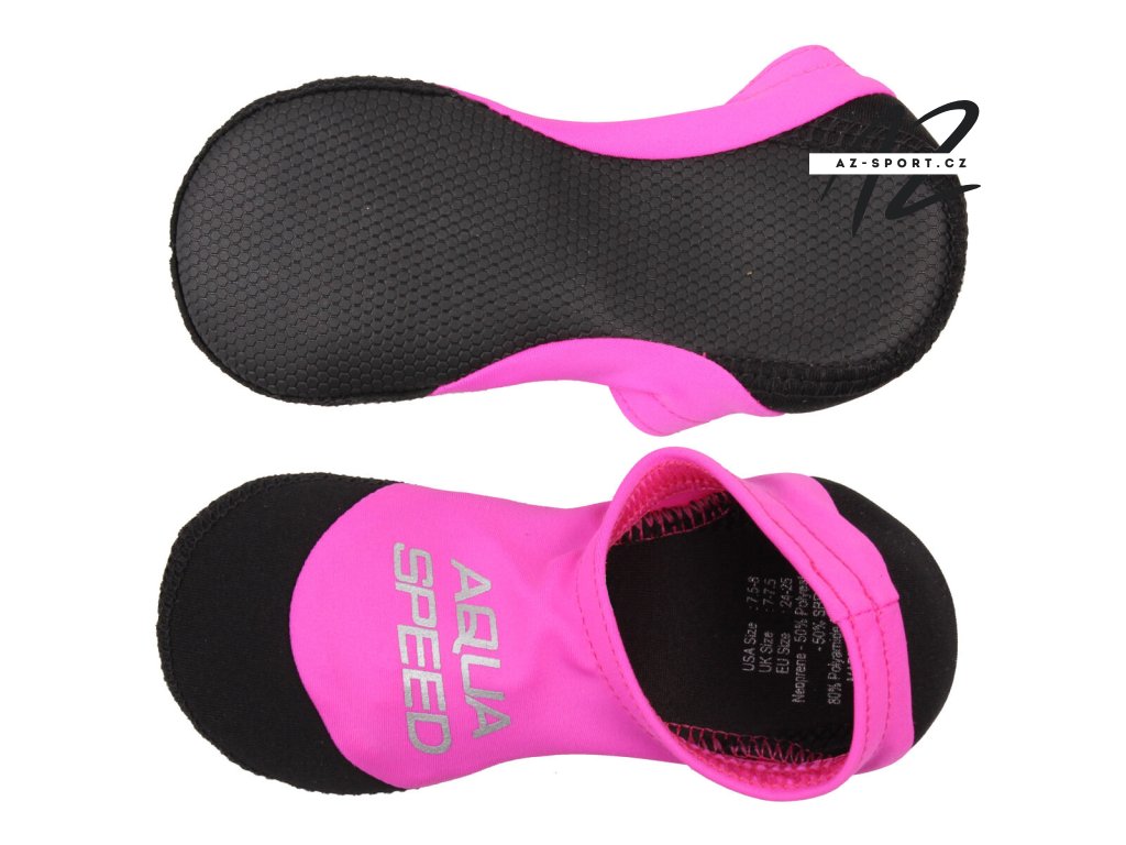 Dětské neoprenové ponožky Aqua-Speed Neo jsou více, než jen zajímavý doplněk pro děti na pláž nebo k bazénu. Ponožky jsou skladné, lehké, pohodlné, snadno se nazouvají, nebrání v přirozeném pohybu a hlavně poskytují ochranu před horkým pískem, chrání chodidla na kamenitých plážích a v případě bazénů minimalizují riziko uklouznutí. Ponožky jsou vyrobeny z měkkého a elastického materiálu v horní části a silnějšího neoprenu na podrážce s protiskluzovým povrchem. Material: Neopren (50% Polyester 50% Guma SBR); 80% Polyamid 20% ElastanDoplňkové parametry