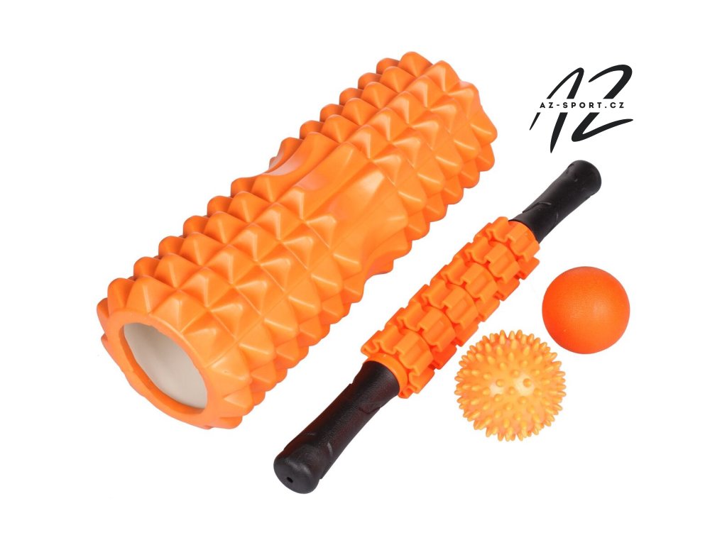 Praktický masážní set obsahující válec, dva míčky a masážní tyč.