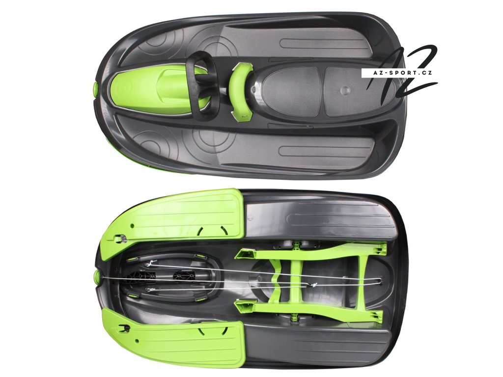 Dva roky výzkumu vedly k vývoji tohoto unikátního bobu Stratos, který přiváží zatáčení pomocí diferenciálu, jenž zvyšuje rychlost v zatáčkách, protože každá lyže může zatočit pod různým úhlem, automatický navíjecí mechanismus tažného lana, masivní brzdu s pružinou k navrácení do původní polohy a dvě sedátka. To vše na jednoduchý click-on mechanismus a tedy žádné kovové prvky, žádná koroze, žádná zbytečná montáž. 98 x 56 x 23 / 30 cm; maximální zatížení 90 kg.Doplňkové parametry